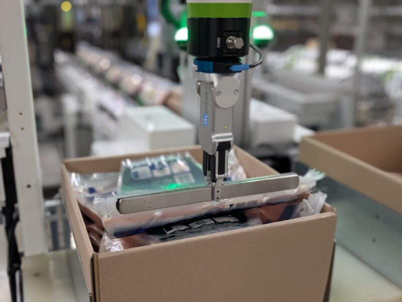 Een collaboratieve robot (cobot) werkt vlot samen met mensen en heeft geen hekwerk of afscherming nodig. De footprint van zo’n cobot-opstelling is dus een stuk kleiner dan een volledig uitgewerkte robotapplicatie. Een groot voordeel, aangezien er vaak weinig beschikbare ruimte is in productieomgevingen. Net zoals standaard robots, zijn cobots ideaal om repetitief, tijdrovend, zwaar en vuil werk te verrichten, zoals dozen palletiseren, dozen vullen, machines laden en ontladen … Iets waar je anders moeilijk personeel voor vindt. Cobot applicaties die wij bouwen, hebben een korte insteltijd dankzij onze gebruiksvriendelijke en op maat gemaakte cobot software.